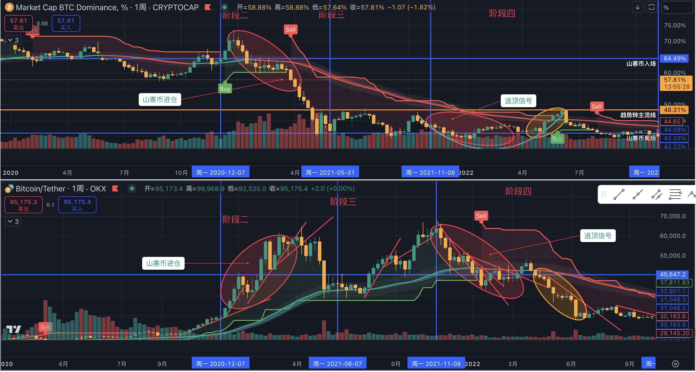 | 三阶段 | 比特币和山寨币持续创新高 | 呈现横盘或下跌 |