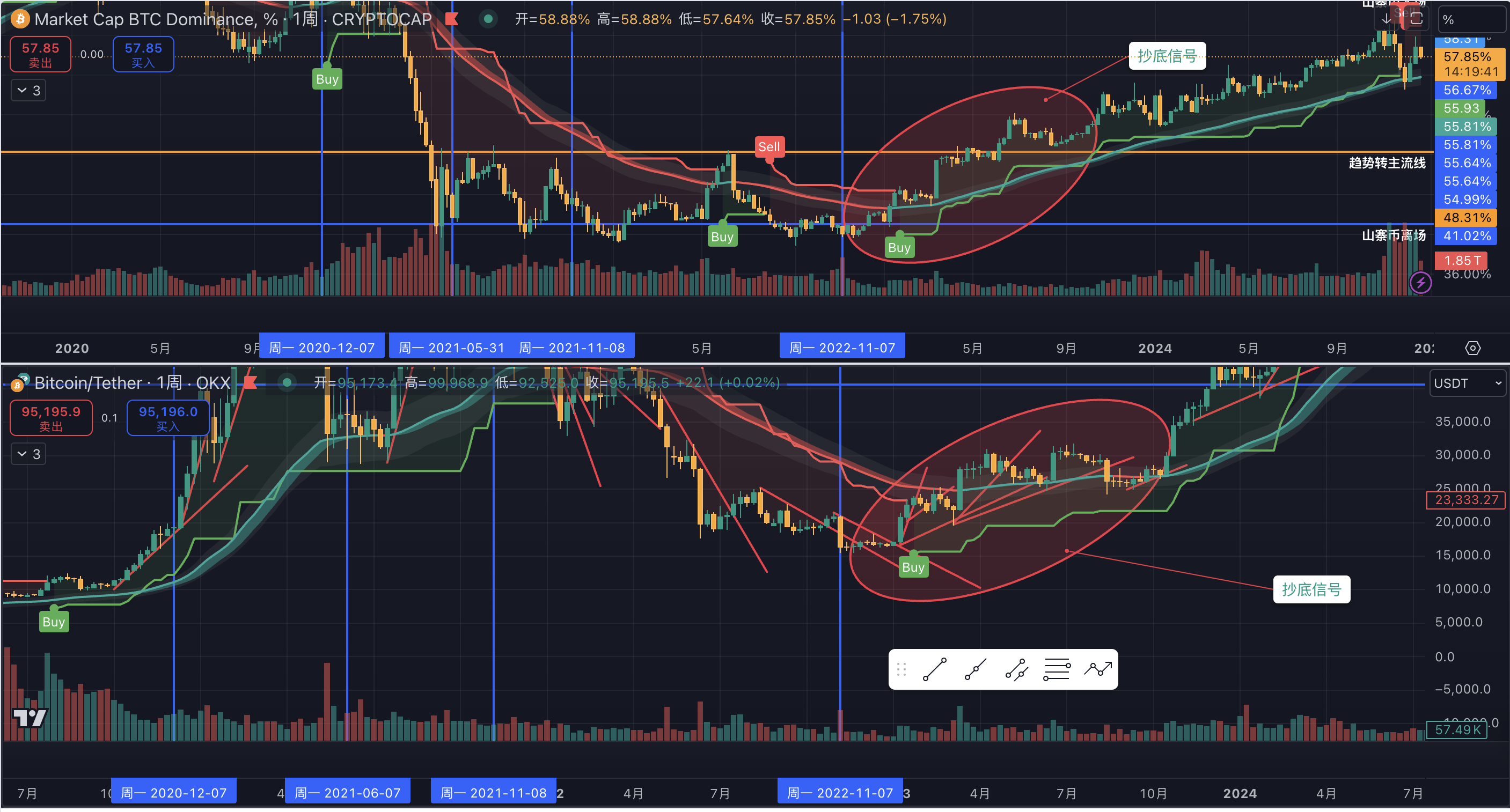 在熊市中抄底比特币需要采用分仓策略,以分散一次性加仓的风险。一般来说,当BTC.D(比特币市值占比)经历大幅下跌后开始横盘,并逐渐缩小震荡区间时,就可以关注抄底的机会(例如2022年11月的市场表现)。随后,随着 BTC.D逐步上涨 ,比特币价格也开始企稳或缓慢回升,此时分批进入仓位是较为稳健的策略,有助于在风险较低的情况下逐步建立持仓。
