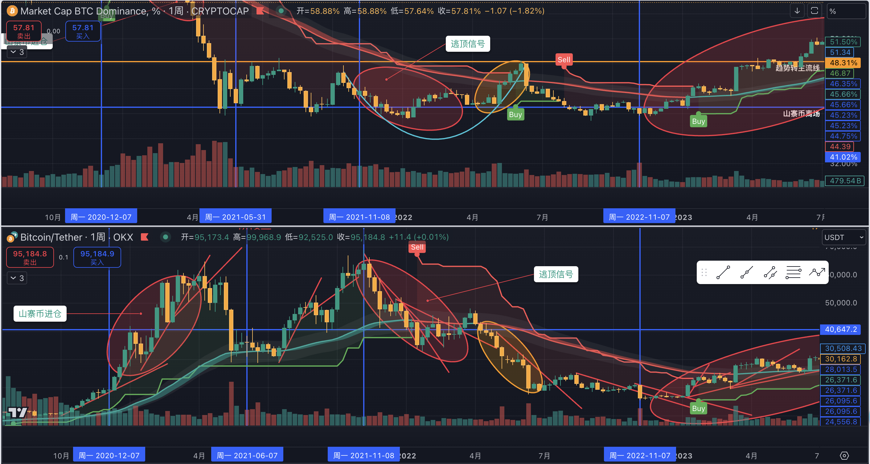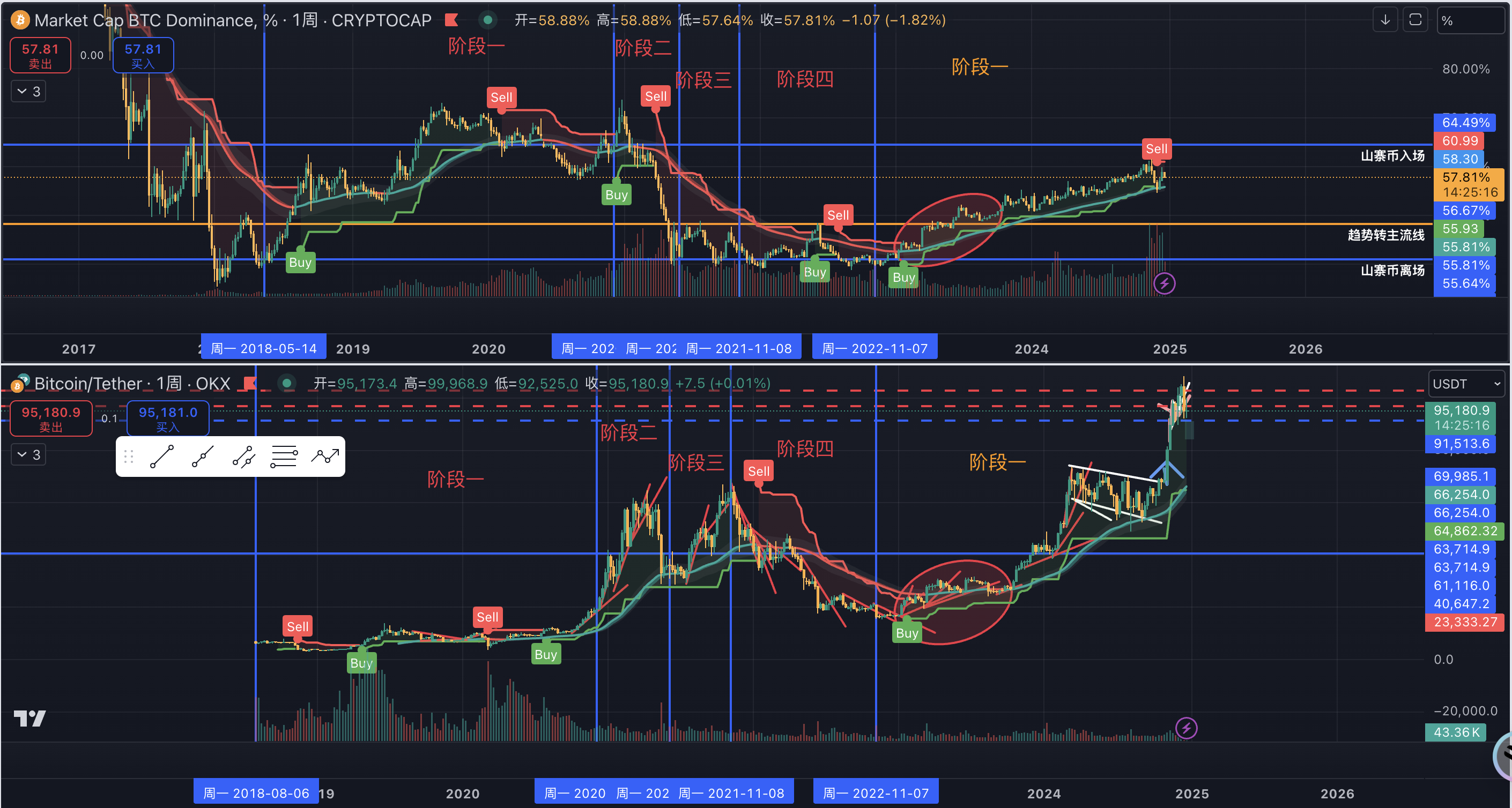 当比特币币价上涨,而 BTC.D 开始盘整或下跌时,通常意味着市场资金正从比特币流向山寨币,反映出投资者风险偏好提升,追逐高收益资产。这时可以适量调整投资组合,增持山寨币以捕捉潜在的更高回报,同时关注山寨币市场的热点与轮动节奏,以优化收益机会。
